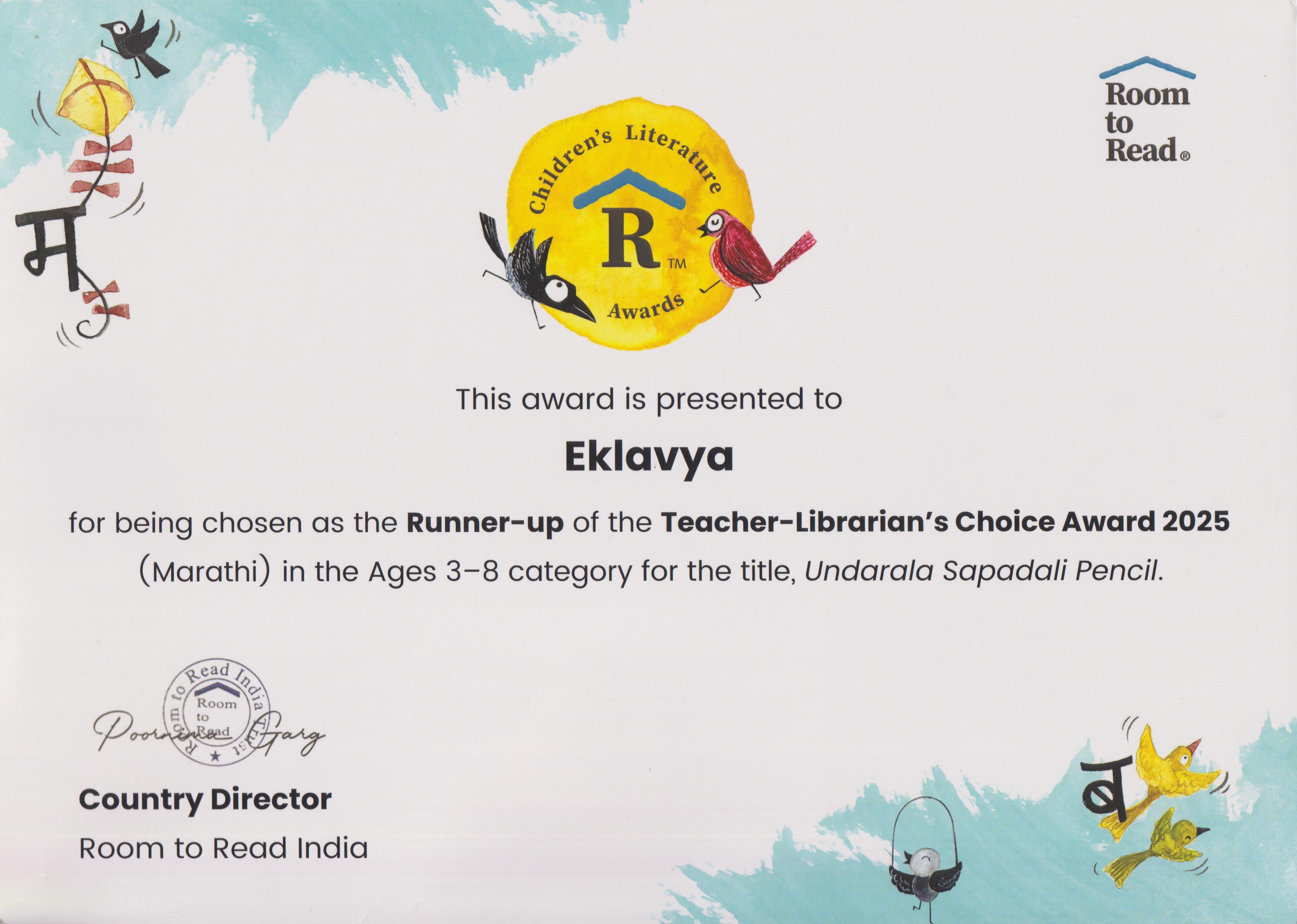 | 📘 | Children's Literature Awards 2025 Ages 3-8 – Undarala Sapadali Pencil (Marathi) | Runner-Up | View Award |