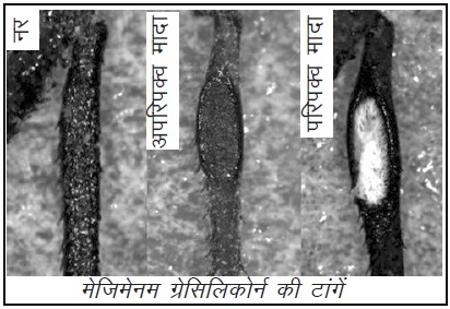जब फुकात्सु और उनके साथियों ने एक नदी के किनारे खीरे की बेल से मेजिमेनम ग्रेसिलिकोर्न के नमूने एकत्रित किए तो उन्होंने भी देखा कि लैंगिक रूप से परिपक्व मादाओं पर ऐसे रेशे चिपके हुए थे। यह पट्टी चावल के दाने से भी छोटी थी और इलेक्ट्रॉन सूक्ष्मदर्शी से देखने पर पता चला कि इसकी सतह कान के पर्दे के समान चिकनी नहीं बल्कि खुरदरी है और उस पर महीन छिद्र थे जिनमें से फफूंद पनप रही थी। सावधानीपूर्वक विच्छेदन करने पर दिखा कि हरेक छिद्र में एक ग्रंथि है जिसमें से तरल रिस रहा है।