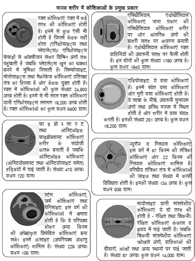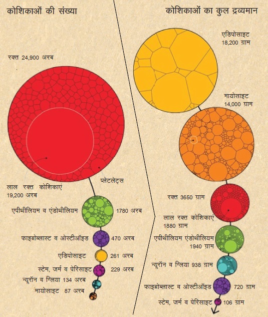 खैर नियम लागू हो ना हो, हम मानव शरीर में कोशिकाओं के प्रकारों और उनकी संख्या के आंकड़े देखने का आनंद तो ले ही सकते हैं।