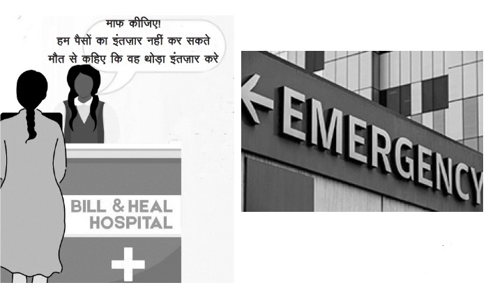 आपात समय में मरीज़ के परिवारजन घबराए होते हैं और कभी-कभी आर्थिक स्थिति भी कमज़ोर होती है। ऐसे मौके पर क्या अस्पताल को थोड़ी नरमी नहीं दिखानी चाहिए? मरीज़ की जान से जुड़ी स्थिति में अस्पताल इतनी कठोर नीति क्यों अपनाते हैं? और आखिर किसने निजी अस्पतालों को यह हक दिया कि वे मरीज़ की जान को इस तरह जोखिम में डालें?
