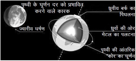 दरअसल, पृथ्वी की घूर्णन गति में दीर्घावधि गिरावट मुख्य रूप से चंद्रमा के कारण होती है। चंद्रमा समंदरों पर आकर्षण बल लगाता है जिसकी वजह से घर्षण पैदा होता है और धरती अपने अक्ष पर थोड़ा धीमे घूमने लगती है। इस मंदन के कई रोचक परिणाम होते हैं। जैसे 2000 साल पहले ग्रहण आज की घूर्णन गति के आधार पर की गई गणना से थोड़ा अलग समय पर दिखते थे। और तो और, प्राचीन तलछटों के विश्लेषण से लगता है कि करीब 1.4 अरब वर्ष पूर्व दिन शायद आजकल के सिर्फ 19 घंटों के बराबर हुआ करता था।